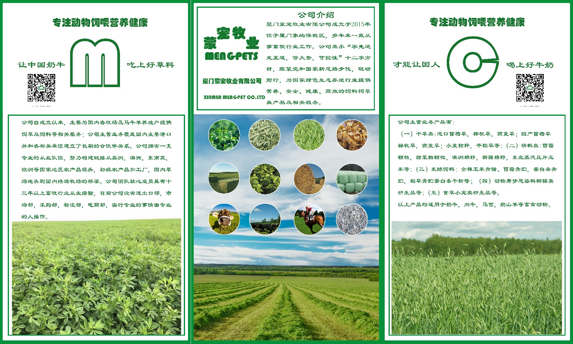 廈門蒙寵牧業有限公司位于廈門象嶼保稅區,多年來一直從事畜牧行業工作。公司秉承“學先進,走正道,傍大勢,可控性”十二字方針,砥礪前行,為國家綠色生態養殖行業提供營養、安全、健康、高效的飼料類產品。
